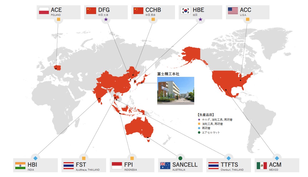 富士精工は韓国・インドネシアといったアジアから、アメリカ・メキシコ・ポーランドまで海外に9カ国(全11拠点)に進出。