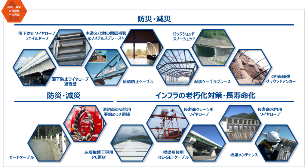 橋梁用ケーブルの設計から製造、点検、メンテナンスまで総合サービスを提供するほか、耐震・防災関連商品の新製品開発・製造・販売を実施。