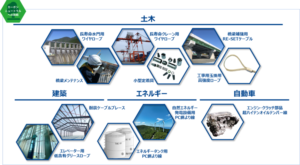 「東京スカイツリー」や「あべのハルカス」などの超高層用エレベーターロープなどの高機能品から幅広い分野で利用される一般品まで、多種多様なワイヤーロープを製造・販売。