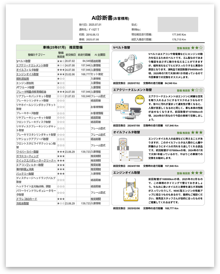 車両の入庫状況などをもとに必要な整備を「予測」し、見積・解説・提案書を自動生成するシステム「T’aime(テーム)」を提供しています。
