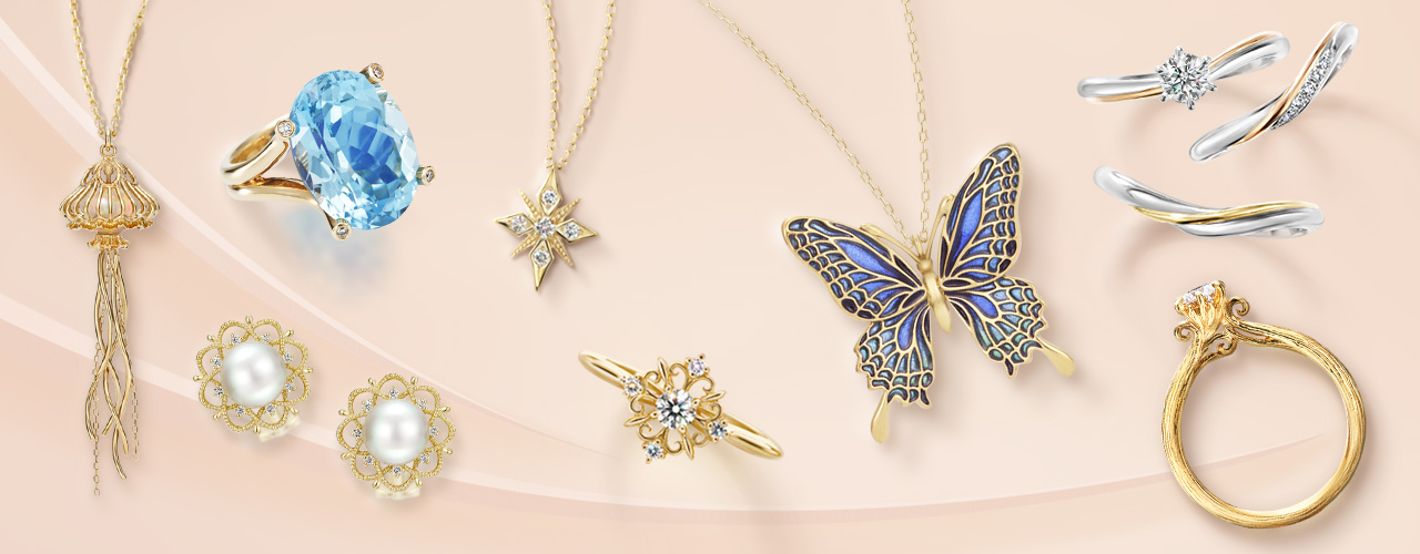 結婚指輪や婚約指輪といったブライダルジュエリーをはじめとし、ネックレス、リング、時計など様々な商品を取り扱い、ケイウノオリジナル商品の他にも、オーダーメード・リフォームも承っています。