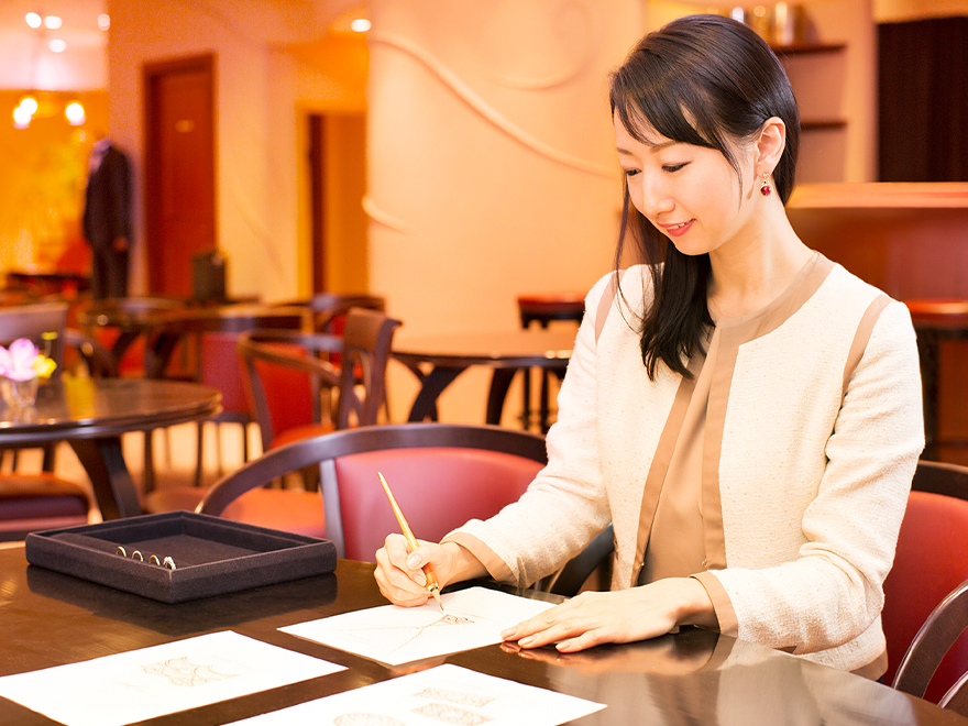 「あとちょっとこうだったらいいのにな・・・」という顧客の本音に答えるためにオーダーメイドが始まりました。幅、厚み、表面加工、石の種類・数、刻印など自由にカスタマイズできます。店舗に専属デザイナーが常駐しており、顧客の要望を引き出し何枚ものデザインを描き、その場で想いをカタチにします。培った知識や技術を駆使し、顧客の要望にとことん向き合います!