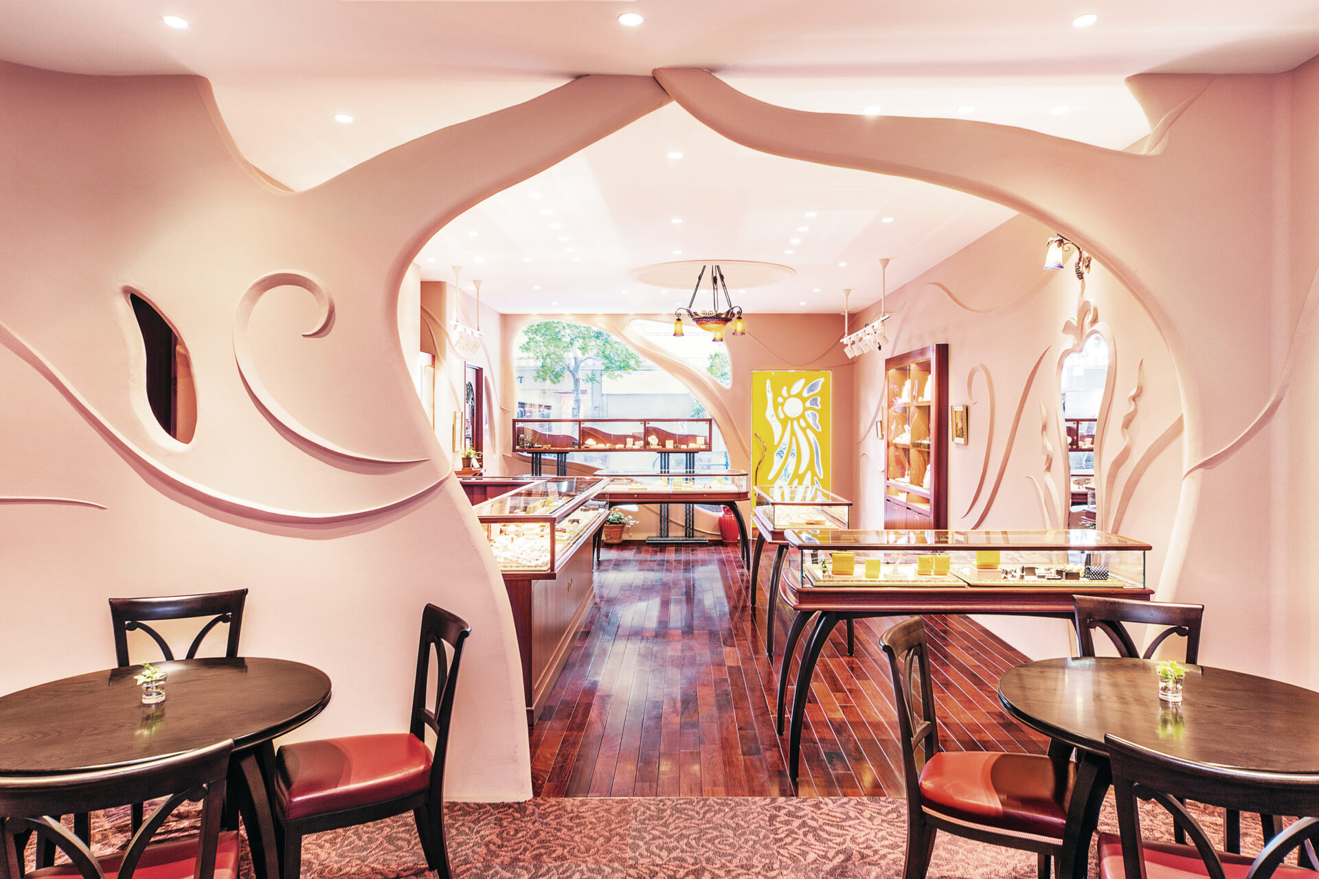 ケイウノでは、「夢のある空間でジュエリー選びをお楽しみいただきたい」という想いから、ショップは創業者自らデザインしています。“幸せのジュエリーを作る妖精が棲むお店”をコンセプトにしており、競合他社とは異なり、店内はとてもファンタジーな雰囲気です。直線を極力排除しており、展示台もオーダーメイドの湾曲している台を使用。スタッフもかっちりした服ではなく柔らかい印象を与えています!