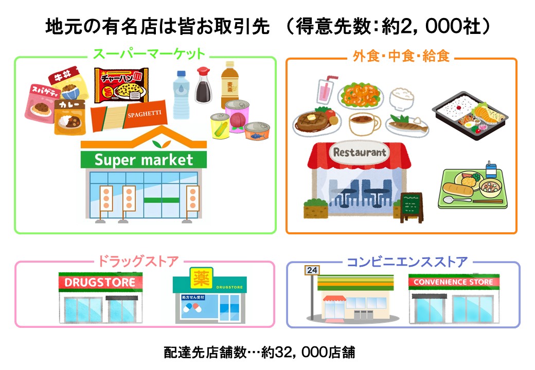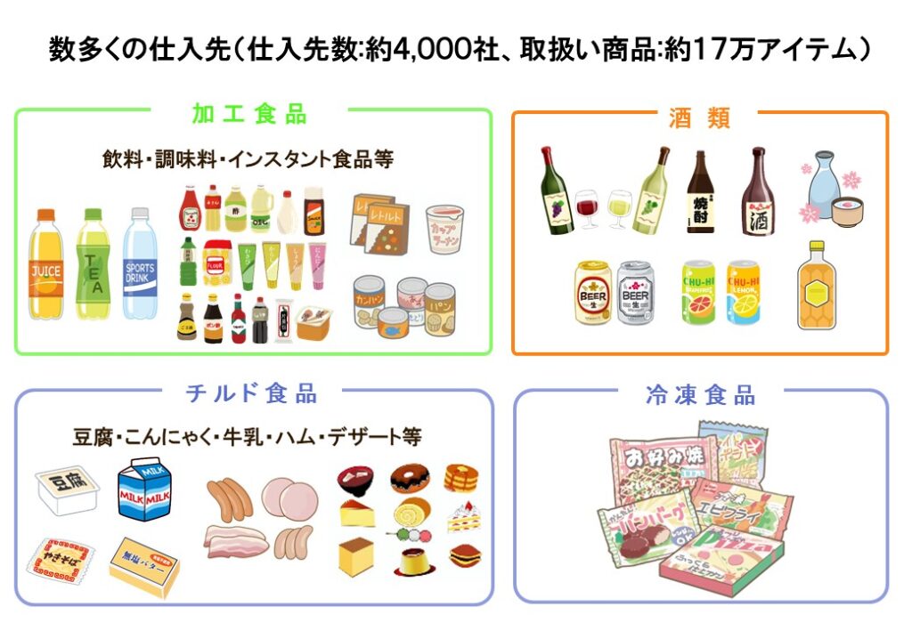 食品・酒類を中心に多彩な商品を仕入れ、スーパーマーケットや外食、中食、給食、コンビニエンスストア、ドラッグストアなど、幅広いチャネルへ卸売しています。